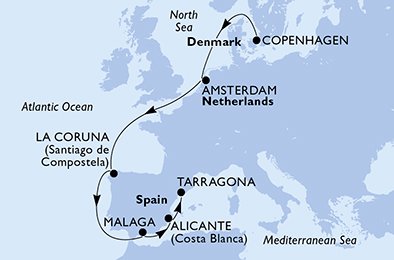 - Koppenhága -> tengeren -> Amsterdam Netherlands -> tengeren -> tengeren -> La Coruna (Santiago de Compostela) Spain -> tengeren -> Malaga (Granada) Spain -> Alicante Spain -> Tarragona Spain
